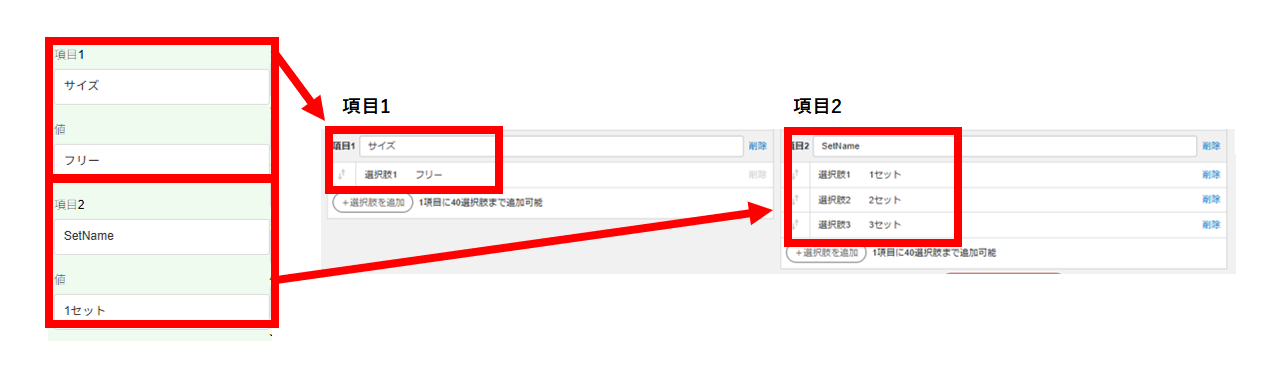 ③クロスマのバリエーション項目とRMS上の選択肢別項目を完全一致で合わせてください。