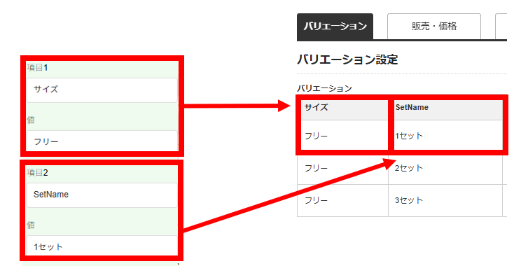 楽天市場の場合、バリエーション商品の個別コードがないため、バリエーション項目が各商品を識別する要素となります。
