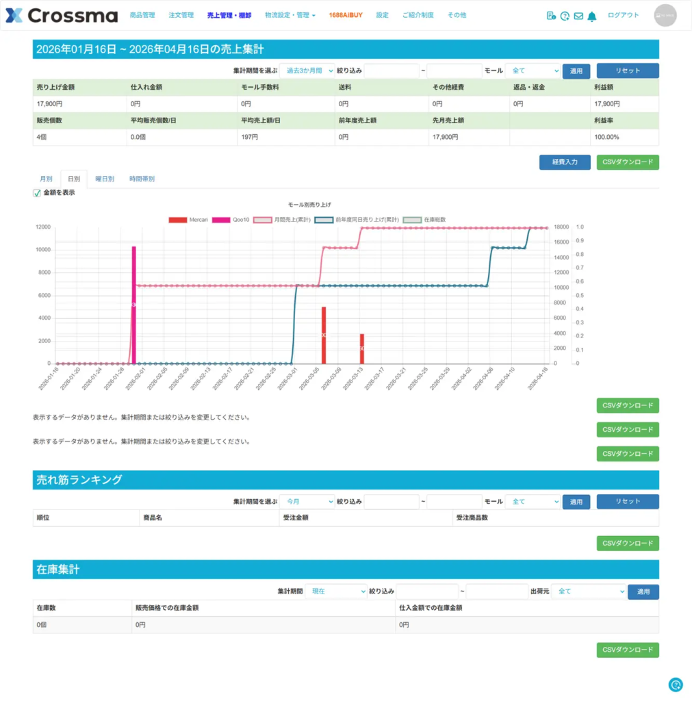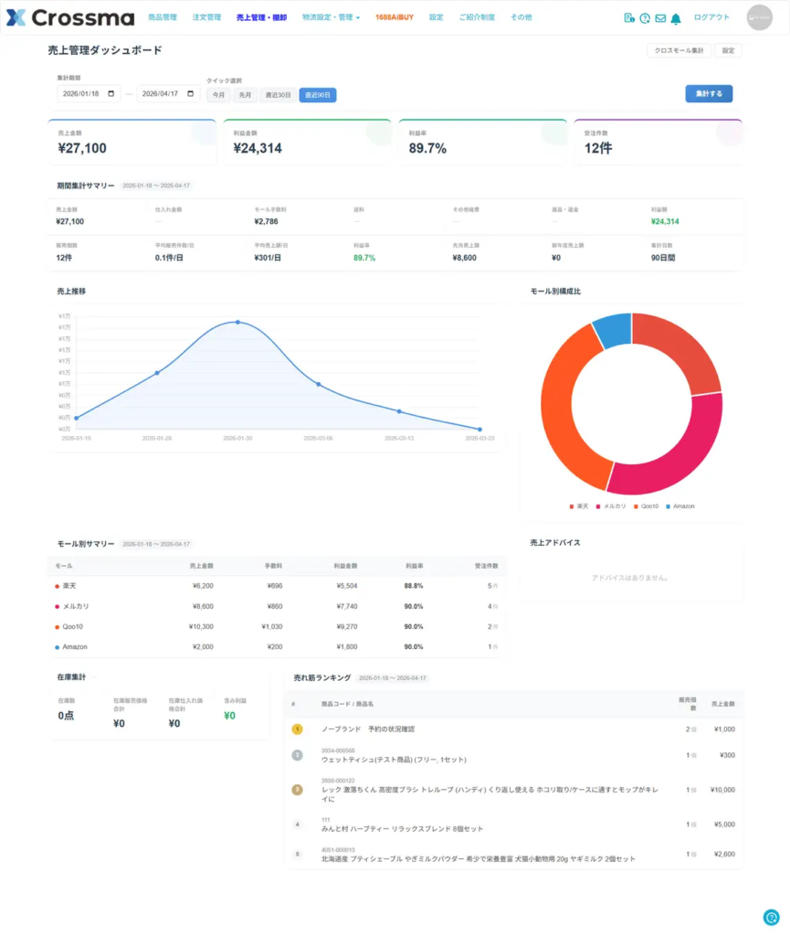 クロスマは、複数のネットショップの販売データを集約し、直感的に分析を可能にする「売上管理ダッシュボード(ベータ版)」を公開しました!