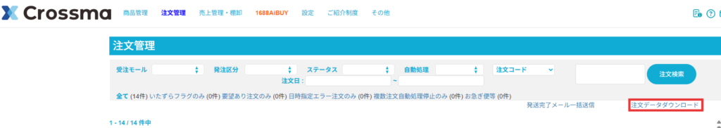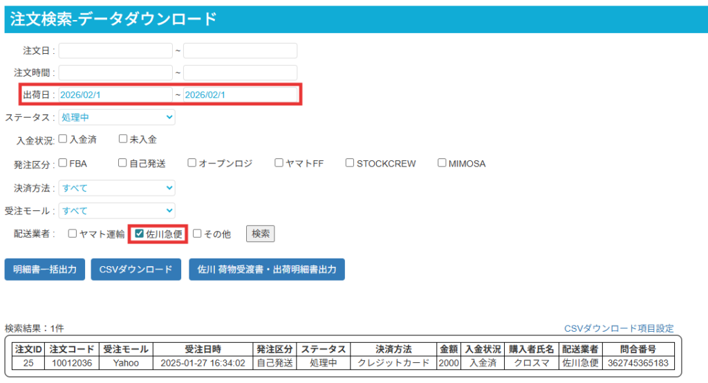 【1】送り状を発行作業が終了後、注文データダウンロードへアクセスし対象の注文を出荷日・配送業者で絞り込み検索を実施します。