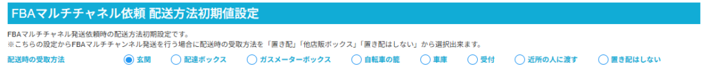 FBAマルチチャネル発送依頼を行う際の 「配送時の受取方法(置き配場所)」の初期値を設定 できます。