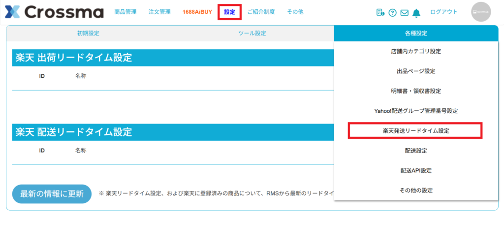 クロスマでは「最新の情報に更新」を実行いただくことで、楽天リードタイム設定に登録済みの商品について、RMSから最新のリードタイム情報を取得します。