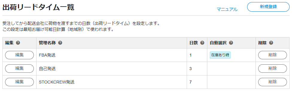 出荷リードタイムを追加する場合は、「新規登録」より設定してください。