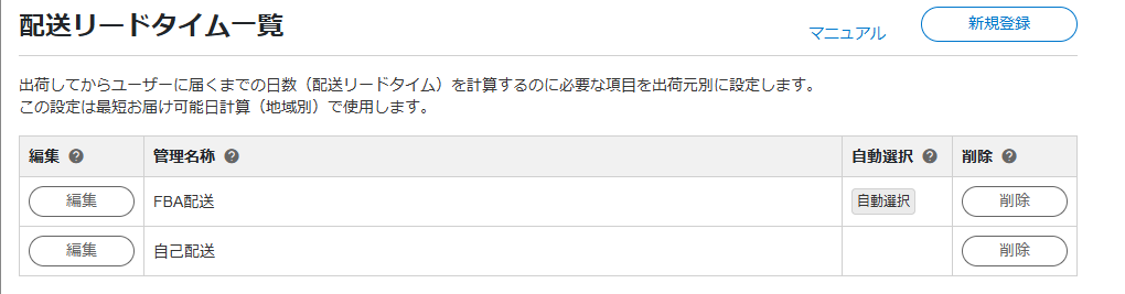 配送リードタイムを追加する場合は、「新規登録」より設定してください。
