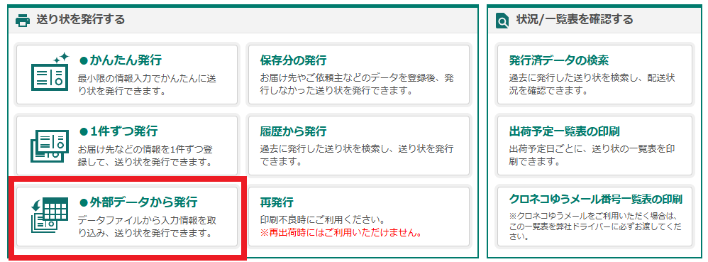 【2】「外部データから発行」をクリック