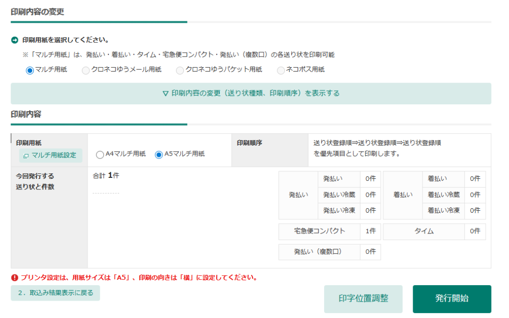 【5】印刷用紙を設定し、「発行開始」